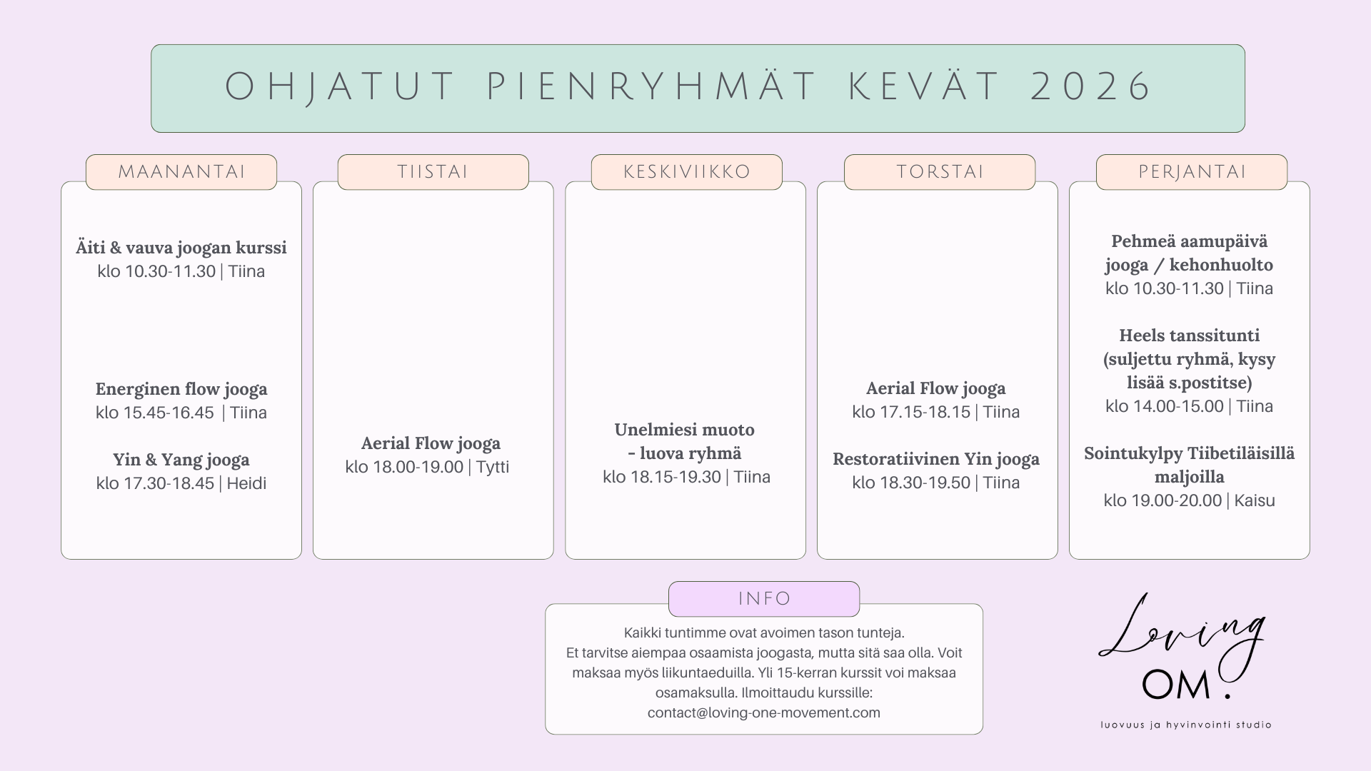 Kevätkauden 2. jakso alkaa! Luvassa mahtava kattaus monipuolista joogaa, tanssia ja taideterapeuttista toimintaa. Ryhmämme pysyvät max 10 hlön kokoisina. Saat sinua huomioivaa ohjausta turvallisessa ja mukavassa ilmapiirissä. Ilmoittaudu mukaan kursseille nyt! Muistathan, että voit huoletta ilmoittautua, vaikka et pääsisikään joka kerralle mukaan. Käy toisilla tunneilla korvaamassa kurssin ajan ja vielä 4 vkoa jälkeen.
